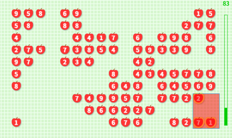 3️⃣ 선택한 사과들의 합이 정확히 10이 되면, 사과들이 사라집니다.